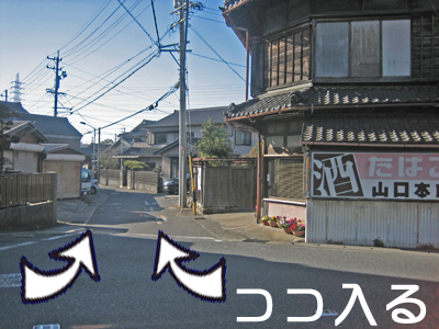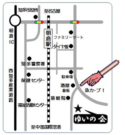 国道155号線(西知多産業道路)「朝倉インター」を降りる 信号「知多市役所東」を右折 急なカーブ(酒たばこの看板あり)を右折 |